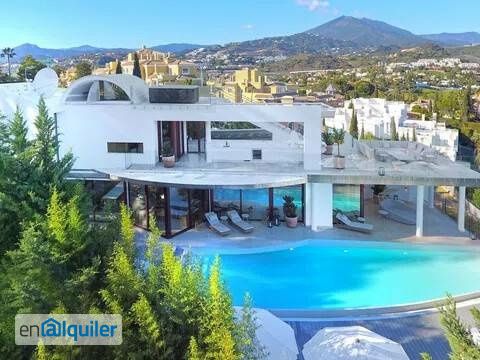 Disponible Alquiler por semanas: Precios desde 5.000Euros la semana a 14.000 Euros la semana (dependiendo de temporada) Ubicado en la exclusiva Nueva Andalucía, a 5 minutos en automóvil del centro de Puerto Banús, así como a playas y áreas recreativas. Esta villa recientemente renovada está construida al más alto nivel y diseñada por el renombrado arquitecto Angel Taborda, conocido mundialmente por su estilo vanguardista. Al ingresar a esta extraordinaria villa, la arquitectura moderna se combina con una vista panorámica de la montaña La Concha, el golf Las Brisas y el mar Mediterráneo. Al instante se sentirá en paz mientras explora el resto de la hermosa casa, dividida en 3 niveles, después de haber considerado cuidadosamente la distribución para maximizar la luz y las magníficas vistas que rodean la propiedad. Desde la entrada principal, la sala de estar en su interior blanco flota junto con la hermosa luz natural que entra por las ventanas de tamaño completo que dan a la vista y al área de la piscina. Girando a la derecha, la cocina totalmente equipada se presenta con un área de comedor con capacidad para 16 personas. Desde el área de la cocina, hay acceso directo a la segunda cocina y lavandería con lavadora y secadora. En el exterior tiene una amplia terraza con palmeras, una gran piscina infinita climatizada y jacuzzi. La excelente zona de barbacoa es ideal para entretenerse y cenar bajo las estrellas, mientras que el bar parcialmente cubierto y el área de descanso en la terraza del segundo piso pueden elevar el ambiente desde una gran fiesta hasta una gran fiesta con total privacidad y vistas hacia las montañas y el mar. Esta es verdaderamente una casa de lujo impresionante. Las 7 habitaciones (para 16) están bien separadas para una total privacidad. Encontrará dos dormitorios principales en el segundo piso con acceso al área de bar y sala de estar. Los impresionantes dormitorios principales son amplios y cuentan con excelentes baños en suite, con vistas al valle que conduce al mar. La planta baja tiene 5 dormitorios con 6 camas king size y 4 baños en suite, todos con acceso a terraza y área de piscina. También encontrará el gimnasio y el salón. Una sala de cine con todas las características, incluyendo play station 4 y mesa de billar. La casa está construida con materiales de calidad y tiene características únicas, como iluminación externa e interna con la última tecnología LED de ahorro de energía. Altavoces de sonido envolvente. Unidades de cocina Poggenpohl con electrodomésticos Gaggenau, que incluyen varios refrigeradores / congeladores, enfriador de vino y máquina de cubitos de hielo. Bar del segundo piso con armarios, lavaplatos, agua potable, refrigeradores, enfriador de vino, máquina de cubitos de hielo, congelador y mesa de comedor de teppanyaki. Un jacuzzi para 5 personas junto a la piscina y un jacuzzi de lujo para 8 personas en la terraza superior con vista panorámica sobre la hermosa montaña de la Concha, el golf de Las Brisas y el mar Mediterráneo.