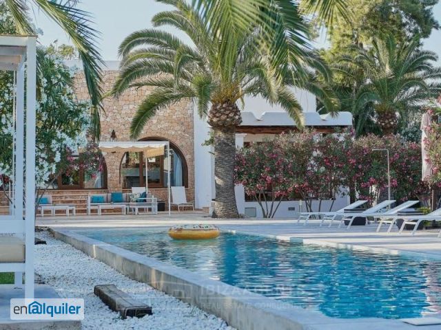 Ubicada en una posición privilegiada, a medio camino entre Santa Gertrudis y la ciudad de Ibiza, esta villa combina privacidad, amplitud y una excelente conexión con los puntos clave de la isla. A tan solo 10 minutos en coche se encuentran el puerto de Marina Ibiza y la playa de Talamanca. La propiedad se asienta sobre una amplia parcela vallada con jardines mediterráneos, varias terrazas cubiertas y una piscina rectangular de 18 metros, rodeada de camas balinesas, hamacas y zonas chill out. Un baño exterior da servicio a la zona de piscina, ideal para la vida al aire libre. El acceso a la vivienda se realiza a través de una terraza porchada que conduce a un vestíbulo, perfecto como recibidor o despacho. Desde aquí se abre un impresionante salón comedor con techos de cinco metros y grandes ventanales que conectan con la terraza principal. En el ala izquierda, la suite principal cuenta con baño en suite y acceso directo a la terraza que conduce a la piscina. En esta zona también se ubican dos dormitorios dobles que comparten un baño con jacuzzi, además de una habitación auxiliar o de servicio con acceso desde el baño. En el ala derecha, una amplia cocina con isla y acceso directo a la cocina exterior con barbacoa invita a disfrutar de comidas al aire libre. Aquí también se encuentra otro dormitorio con dos camas dobles y un baño con ducha. La villa dispone además de zona de lavandería independiente, garaje cerrado con portón automático y aire acondicionado, que ofrece la posibilidad de utilizarse como gimnasio u otro espacio versátil. #ref:A47876L