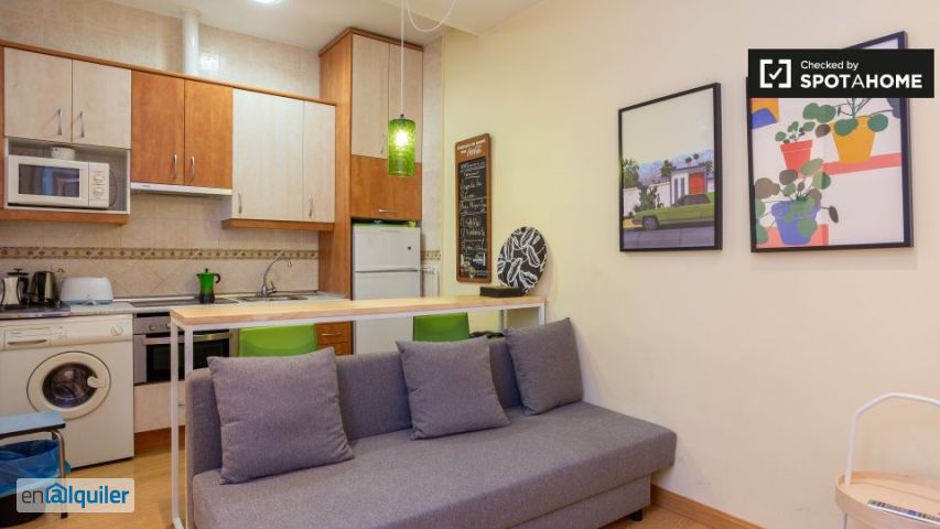 El elegante centro _porque he estado buscando el minimalismo moderno_ ¿me gustará aquí? Nosotros creemos que si. ¿eres una fashionista que busca una configuración simplemente elegante? Empaca tus bolsas (pequeñas), esta podría ser la indicada. ¿de Verdad? Dime más… le encantará la decoración ordenada y contemporánea. Pisos de madera pulida, elegante sala de estar de planta abierta, arte de pared elegante y, para colmo, un cómodo sofá frente al televisor. La barra de desayuno es un gran lugar para comer también. Creemos que este apartamento es ideal para cualquiera que busque un lugar elegante y céntrico. Lavapiés es un barrio emocionante y ecléctico con una excelente selección de restaurantes y bares. Sus 3 razones principales para alquilar aquí: - el apartamento está amueblado a la moda en todas partes. - el sofá del salón se puede convertir en cama. - Explore el cercano Mercado de San Fernando. Pero necesitas saber esto - el apartamento está ubicado en el 2Do piso y no hay ascensor; realice ejercicios de piernas gratis todos los días. - no hay aire acondicionado. ¿es hora de invertir en un ventilador? Su inspector de viviendas, Kelly, dijo: _ “me encantó esta propiedad. Es lindo, moderno y en una excelente ubicación. Tienes algunas de las atracciones más famosas de Madrid a poca distancia, y también transporte público ". _ Ayúdame a decidir Este es un acogedor apartamento de 2 dormitorios en el segundo piso en la calle de la Esperanza, Madrid. Cuenta con una decoración elegante, pisos de madera pulida y arte de pared, y hay una barra de desayuno para disfrutar de sus comidas. Esta propiedad es ideal para cualquiera que busque una ubicación céntrica y moderna. Estarás en un vecindario emocionante, con una gran mezcla de restaurantes y bares para probar. Mientras esté fuera, deténgase en el Real Jardín Botánico y disfrute de un poco de tranquilidad.